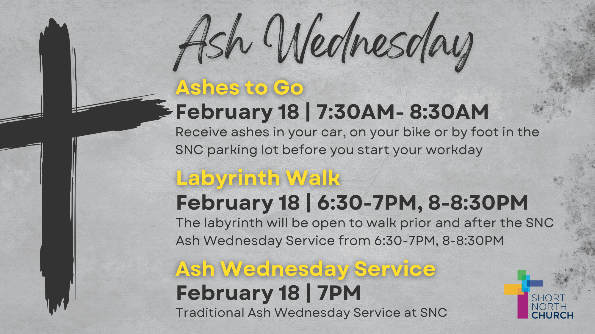 Ash Wednesday Service Date February 18, 2026 Time 7:00 pm Category Lent, Ohio State Campus, Services Ash Wednesday Service | 7PM | SNC Begin the Lenten season with meaningful worship. A prayer labyrinth will be available at 6:30PM and following worship.