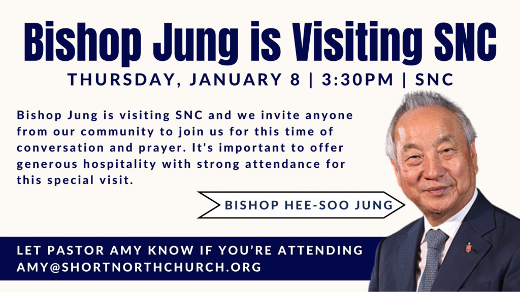 Bishop Jung is visiting SNC and we invite anyone from our community to join us for this time of conversation and prayer. It’s important to offer generous hospitality with strong attendance for this special visit with Bishop Jung. Please RSVP to Pastor Amy if you are able to attend amy@shortnorthchurch.org
