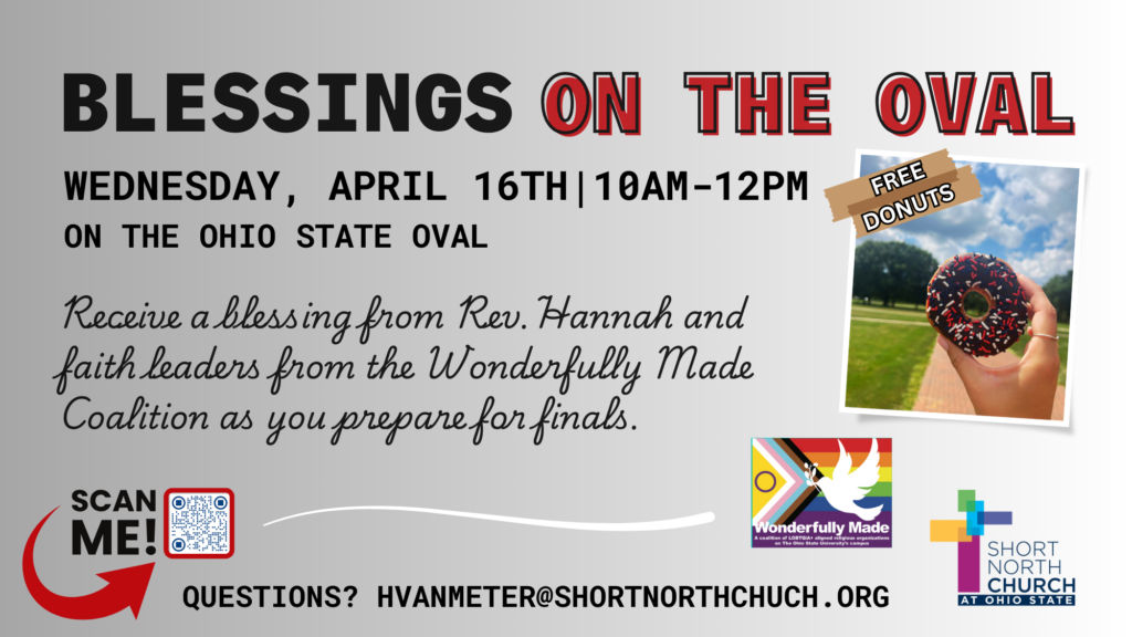 Blessings on the Oval | Wednesday, April 16th | 10-12PM | On the Ohio State Oval Receive a blessing from Rev. Hannah and faith leaders from the Wonderfully Made Coalition as you prepare for finals. Donuts will be provided! Questions? hvanmeter@shortnorthchurch.org