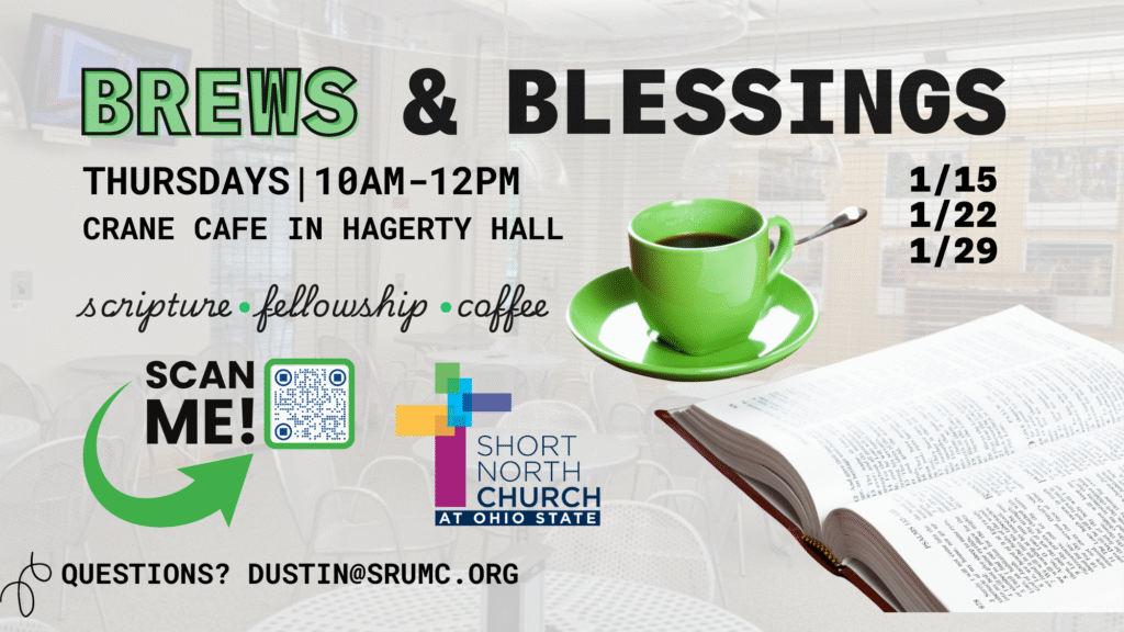 Join us on Ohio State Campus in Crane Cafe in Hagerty Hall for scripture, fellowship and coffee. Questions? dustin@srumc.org