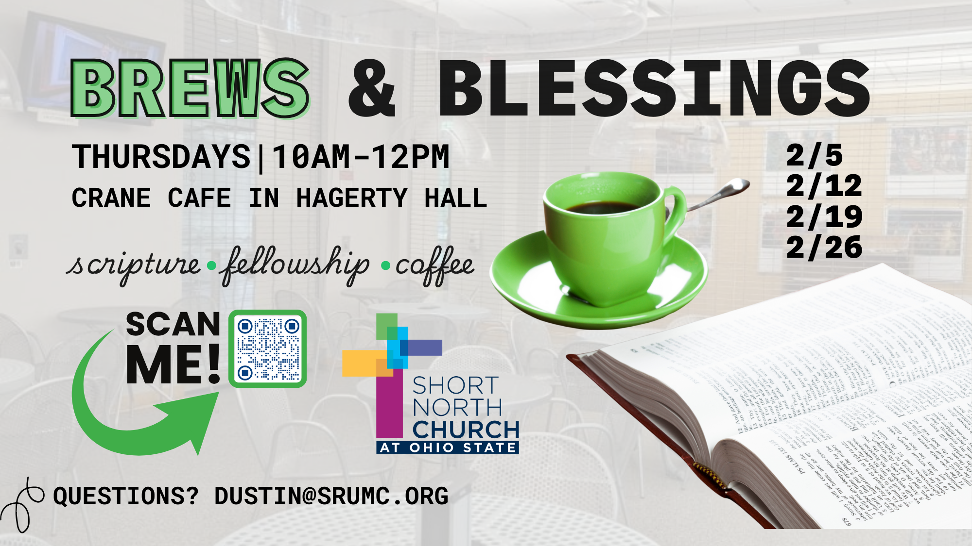 Brews & Blessings Date February 5, 2026 Every Week Time 10:00 am – 12:00 pm Category Ohio State Campus Brews & Blessings | Thursdays, 2/5, 2/12, 2/19, 2/26 | 10–12PM | OSU Campus Join us on Ohio State Campus in Crane Cafe in Hagerty Hall for scripture, fellowship and coffee. Questions? dustin@srumc.org