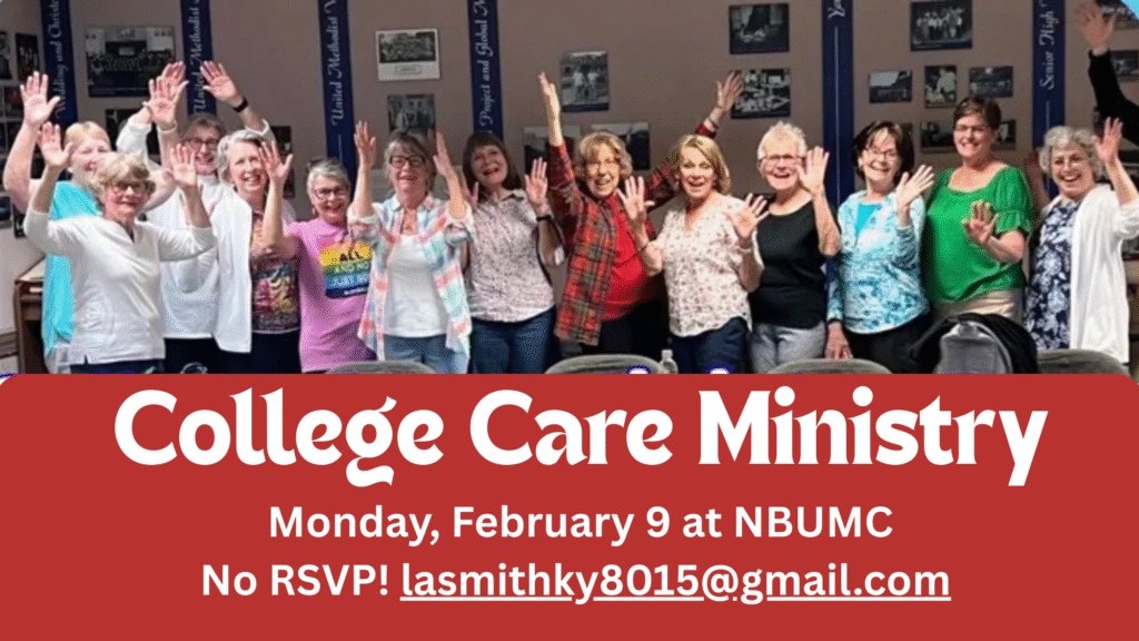 College Care Ministry Date February 9, 2026 Time 6:45 pm – 8:00 pm Address 48 E North Broadway Directions Venue North Broadway UMC Category Community, Fellowship, Lent, Missions, Small Group College Care | Monday, February 9 | 6:45–8PM | North Broadway UMC A group that cares for one another through devotion, conversation, and assembling care packages and cards for college students. Questions? Laura Smith, lasmithky8015@gmail.com