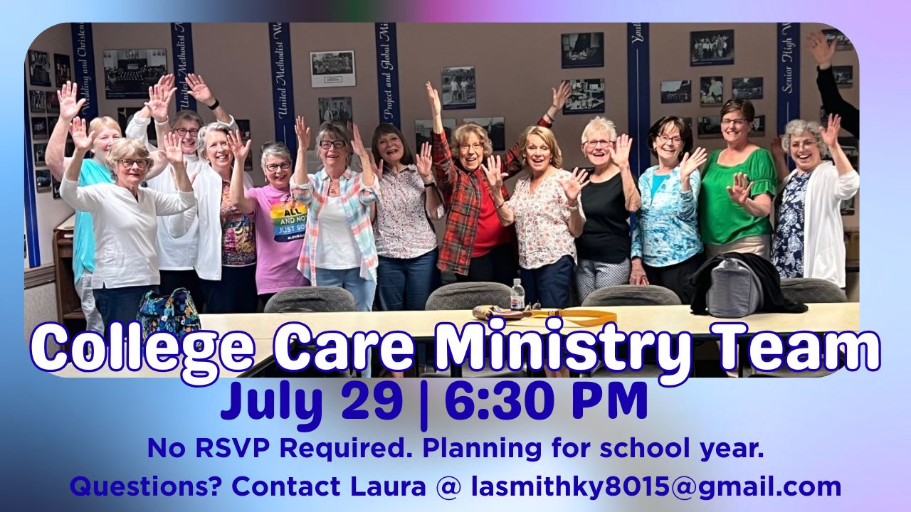 College Care Ministry Date July 29, 2025 Time 6:30 pm Address 48 E North Broadway Directions Venue North Broadway UMC Category Community, Fellowship, Small Group All are welcome to help us spread joy through the school year for our college students. This team meets at North Broadway UMC (48 E North Broadway).