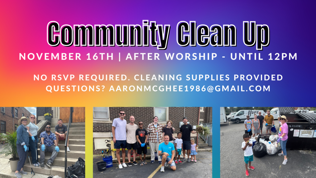 Help care for our neighborhood and church grounds by joining a post-worship cleanup. All ages are welcome and cleaning supplies will be provided. Questions? aaronmcghee1986@gmail.com