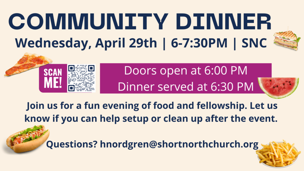 Join us for a fun evening of food and fellowship. Please SCAN QR CODE to let us know you’re attending so we can prepare enough food. Questions? hnordgren@shortnorthchurch.org