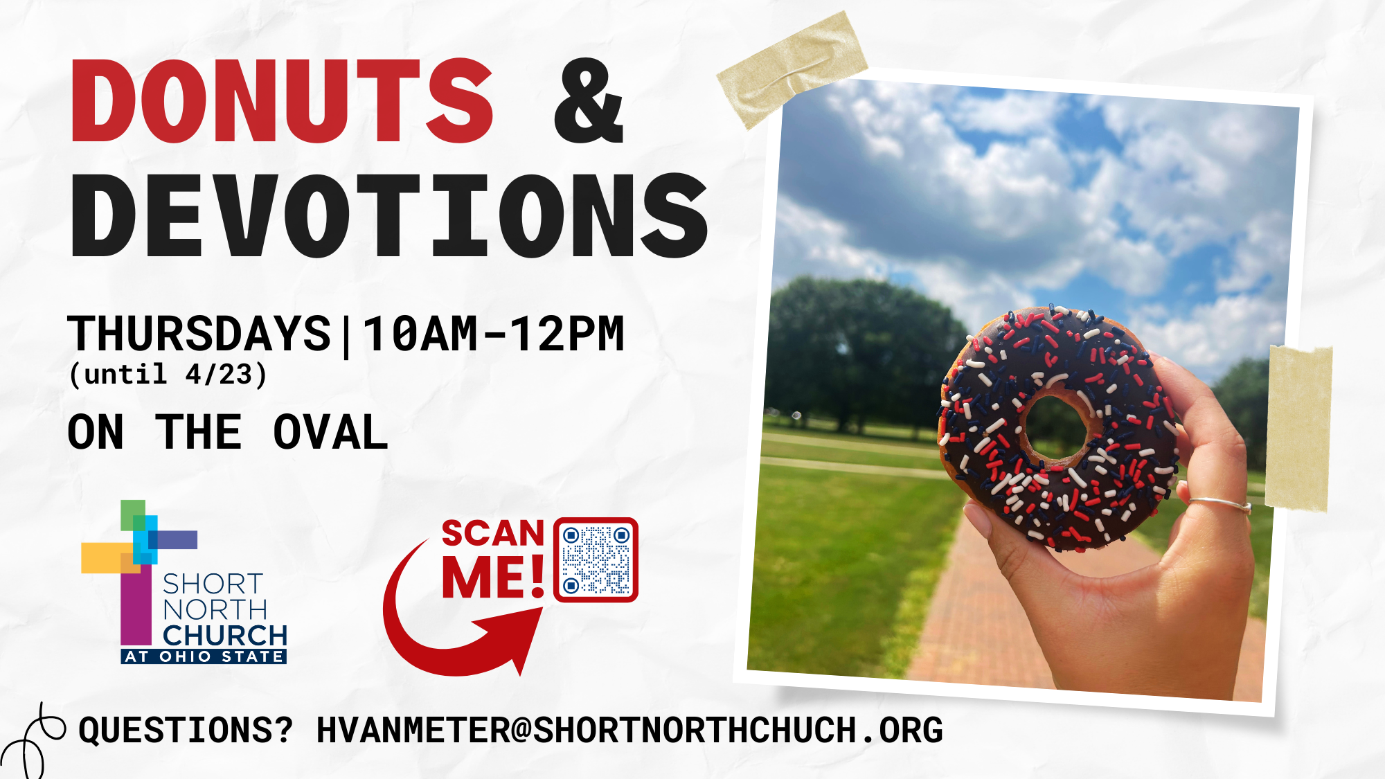 Donuts & Devotions Date April 2, 2026 Every Week Time 10:00 am – 12:00 pm Category Ohio State Campus Donuts & Devotions | Thursdays | 10–12PM | OSU Oval Join us on The Oval for scripture, fellowship and donuts. Our last Donuts & Devotions will be Thursday, April 23rd. Questions? hvanmeter@shortnorthchurch.org