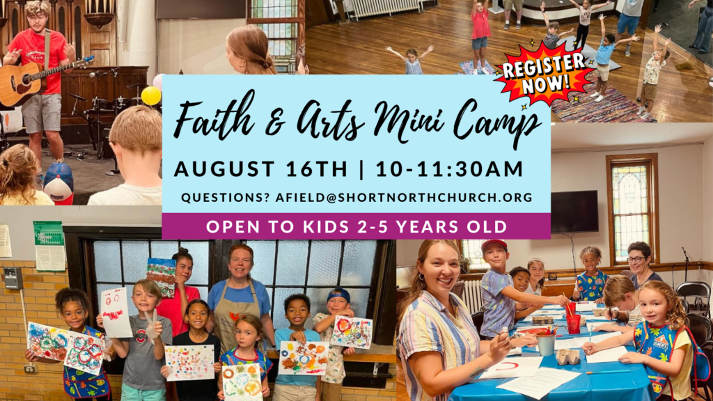 A scaled-down Faith and Arts Camp for kids ages 2–5 with preschool-friendly art, Bible stories, songs, snacks, and fun. Questions? afield@shortnorthchurch.org