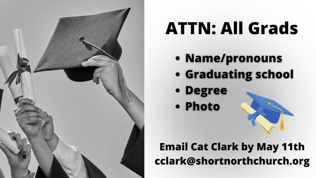 If you are graduating from high school, undergraduate or a graduate program please send Cat Clark cclark@shortnorthchurch.org your name, pronouns, graduating school, degree and a photo by May 11th.