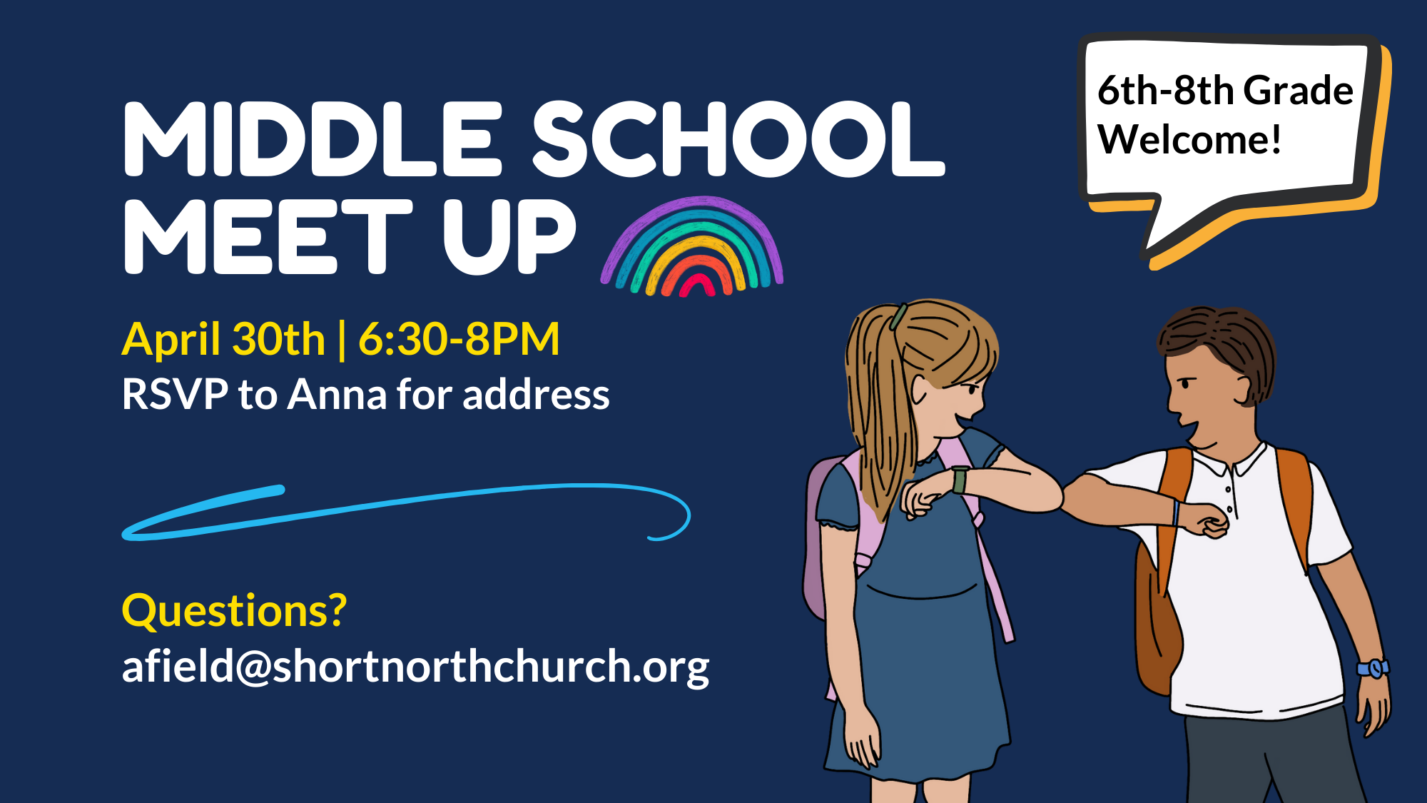 Middle School Meet Up | Wednesday, April 30th | 6:30-8PM | RSVP to Anna for address Students 6th-8th grade are invited to mingle and meet up. RSVP afield@shortnorthchurch.org