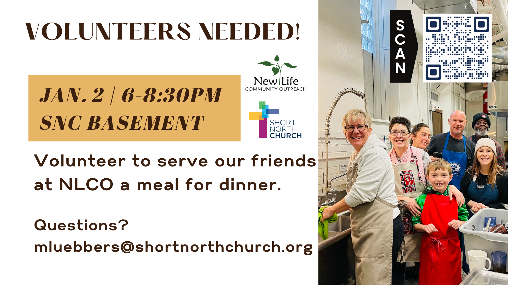 Serve NLCO Dinner Date January 2, 2025 Time 6:00 pm – 8:30 pm Category Advent, Holidays, Missions, Serve, Small Group Sign up here to volunteer: https://www.signupgenius.com/go/20F044DA5A723ABFC1-53546182-nlco