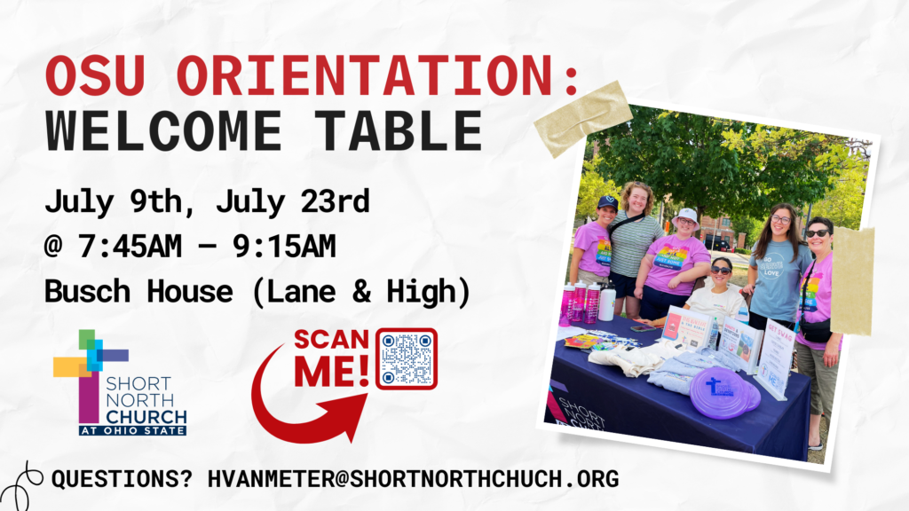 Help us welcome new Buckeyes during orientation on July 9th and July 23rd from 7:45-9:15AM at Busch House (Lane & High). No prep needed—just a warm smile and a heart ready to show them what Love Alive looks like. Questions? hvanmeter@shortnorthchurch.org