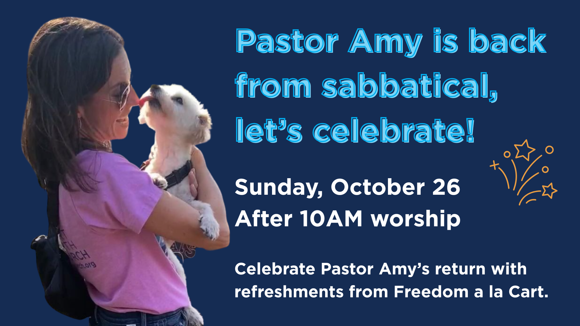 Pastor Amy Returns Date October 26, 2025 Time 10:00 am Category Community, Fellowship Pastor Amy Returns | Sunday, October 26 | After 10AM worship | SNCCelebrate Pastor Amy’s return with refreshments from Freedom a la Cart.