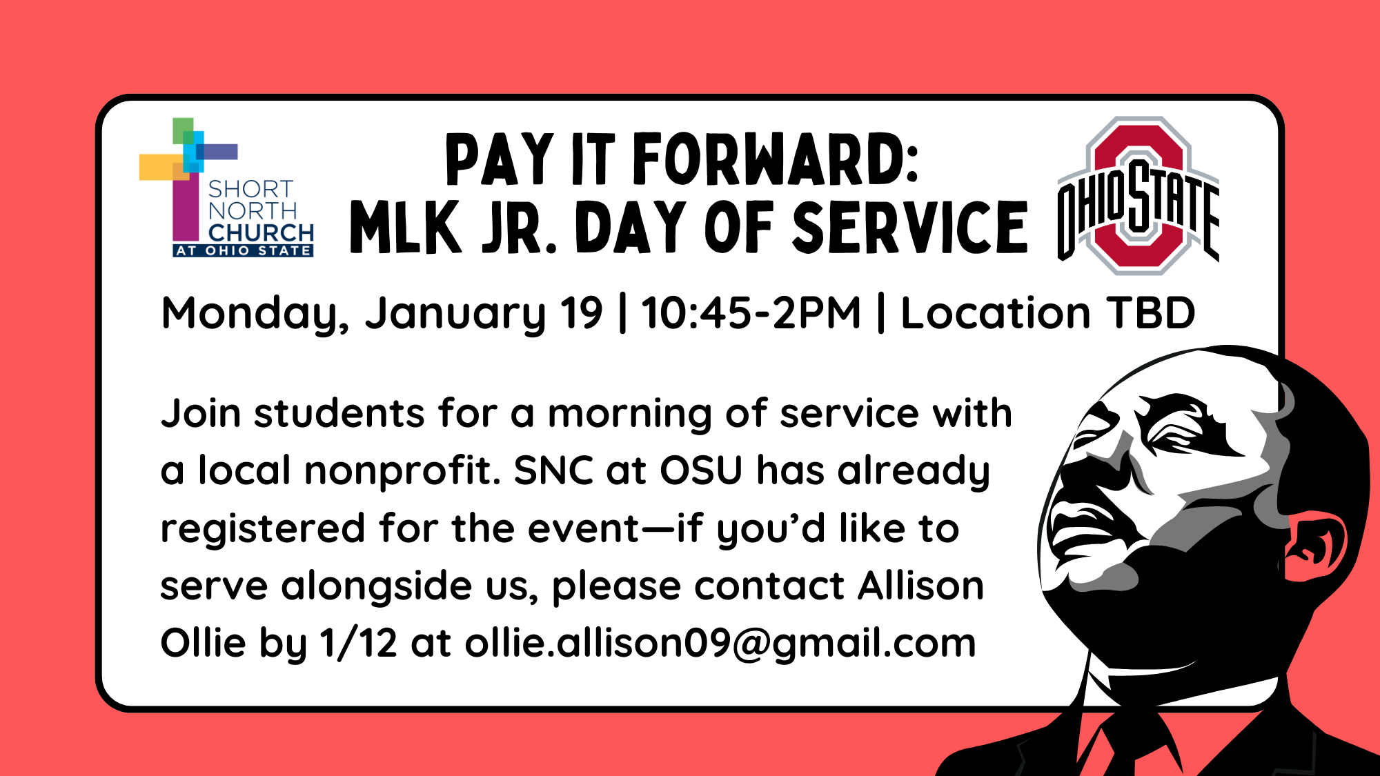 Join students for a morning of service with a local nonprofit. SNC at OSU has already registered for the event—if you’d like to serve alongside us, please contact Allison Ollie by 1/12 at ollie.allison09@gmail.com