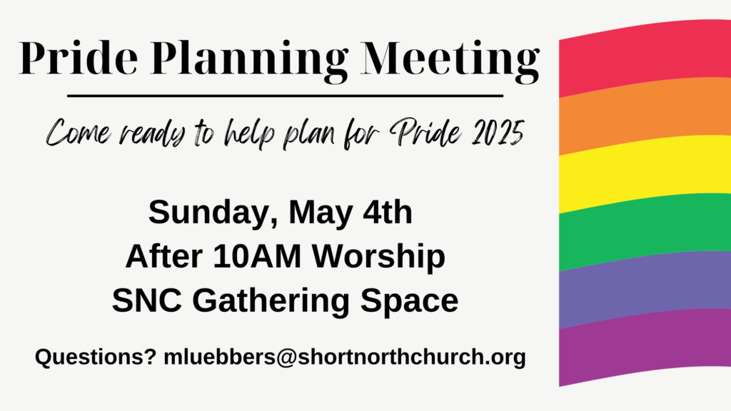 Help us plan PRIDE 2025 our team will gather to plan and create this year’s goals for the parade and more. Want to be part of the planning or have questions? mluebbers@shortnorthchurch.org