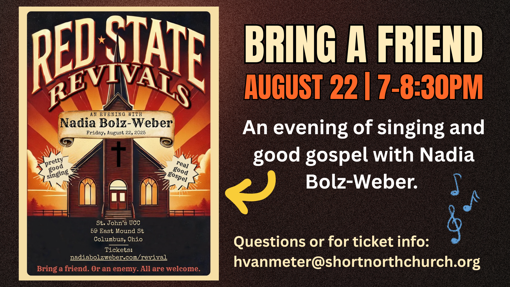 An evening of singing and good gospel with Nadia Bolz-Weber. Questions? hvanmeter@shortnorthchurch.org