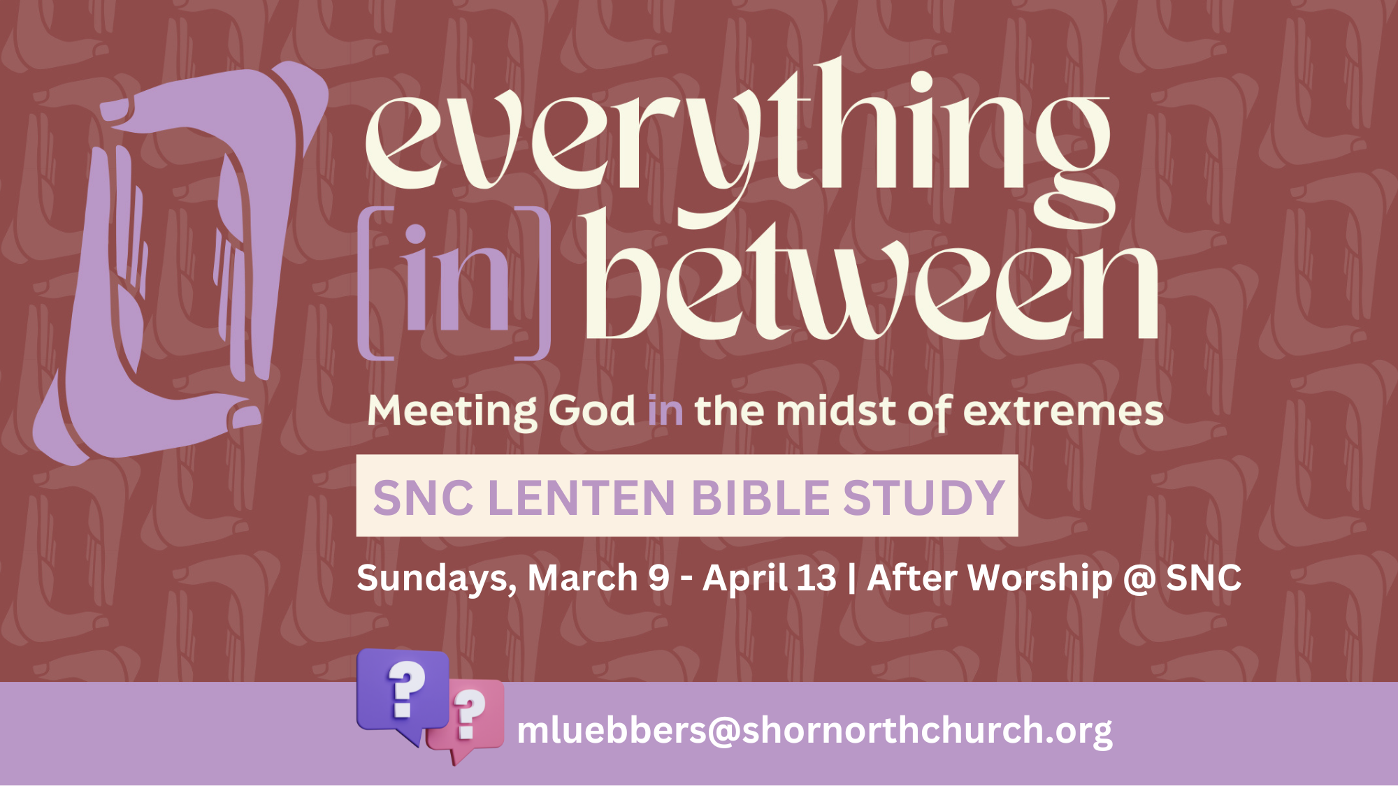 Stay after worship for SNC’s Lent study as we dive deeper into our theme for the season. Each week, we’ll reflect on scripture with art, poetry, and guided devotionals from Everything In Between. Questions? mluebbers@shortnorthchurch.org