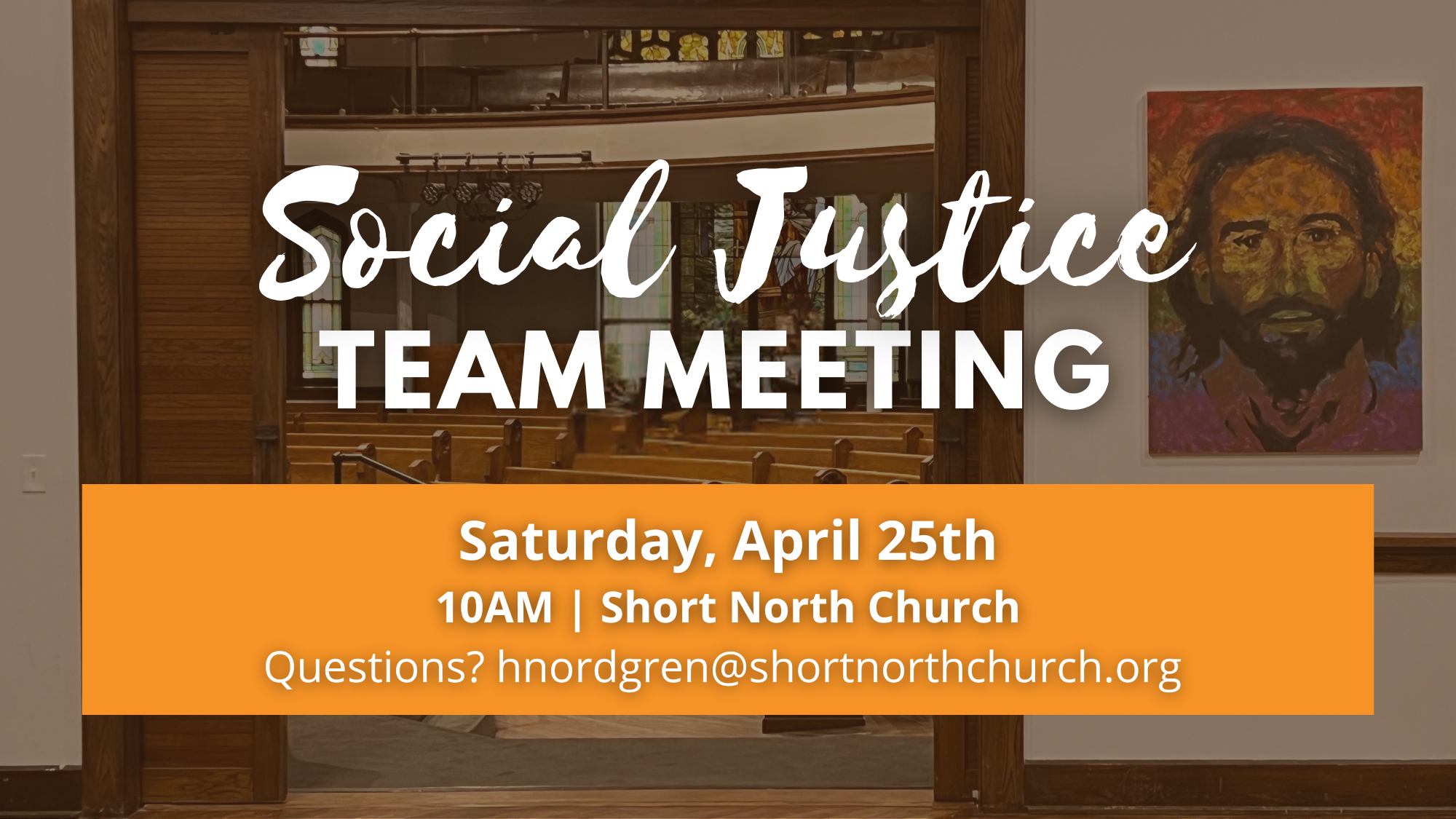 Social Justice Team Date April 25, 2026 Time 10:00 am Venue Short North Church Category Community, Fellowship, Missions, Small Group Social Justice Team Meeting | Saturday, April 25 | 10AM | SNC We will recap the “No Kings 3.0” Rally and start planning for more ways to get involved around the community. Questions? hnordgren@shortnorthchurch.org