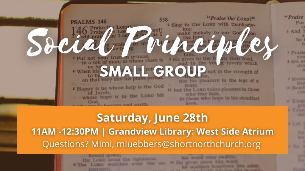 Join us for fellowship and conversation on social principles upstairs at Grandview Library (West Side Atrium) on Saturday, June 28th from 11-12:30PM. No RSVP needed. Questions?mluebbers@shortnorthchurch.org