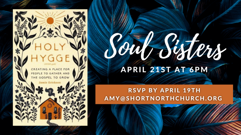 Join us for fellowship and conversation as we reflect on Holy Hygge: Creating a Place for People to Gather and the Gospel to Grow by Jamie Erickson. RSVP by April 19 to amy@shortnorthchurch.org for location details.