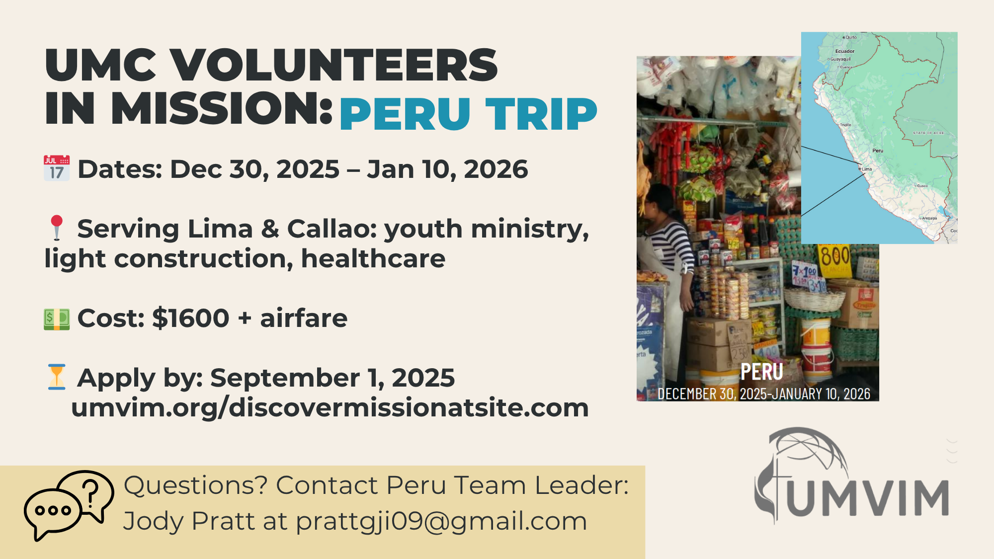 UMC Mission Trip Peru: Deadline Date September 1, 2025 Category Missions, Ohio State Campus, Young Adults Register umvim.org/discovermissionatsite.com