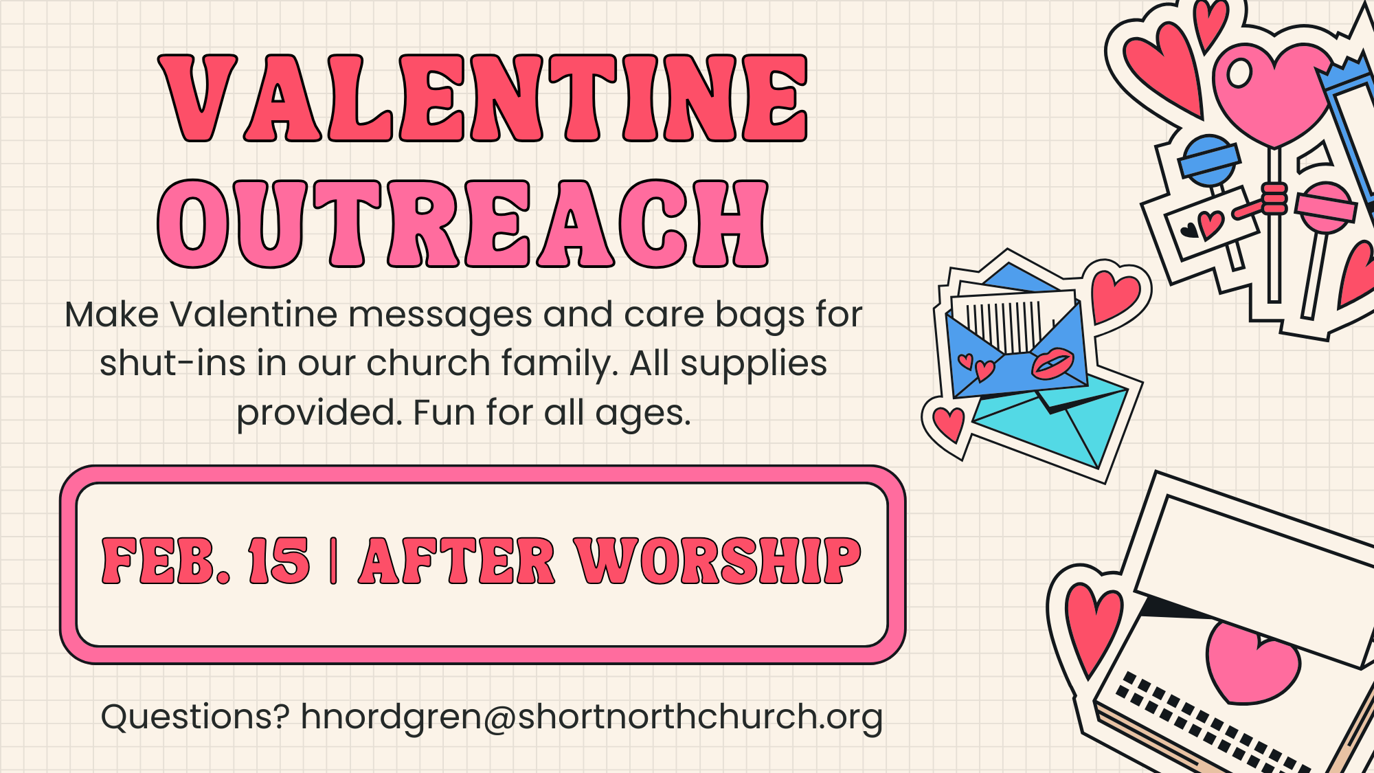 Valentine Outreach Date February 15, 2026 Time 11:00 am Category Community, Fellowship, Lent, Missions, Small Group Valentine Outreach | Sunday, February 15 | After Worship | SNC Make Valentine messages and care bags for shut-ins in our church family. All supplies provided. Fun for all ages. Questions? hnordgren@shortnorthchurch.org