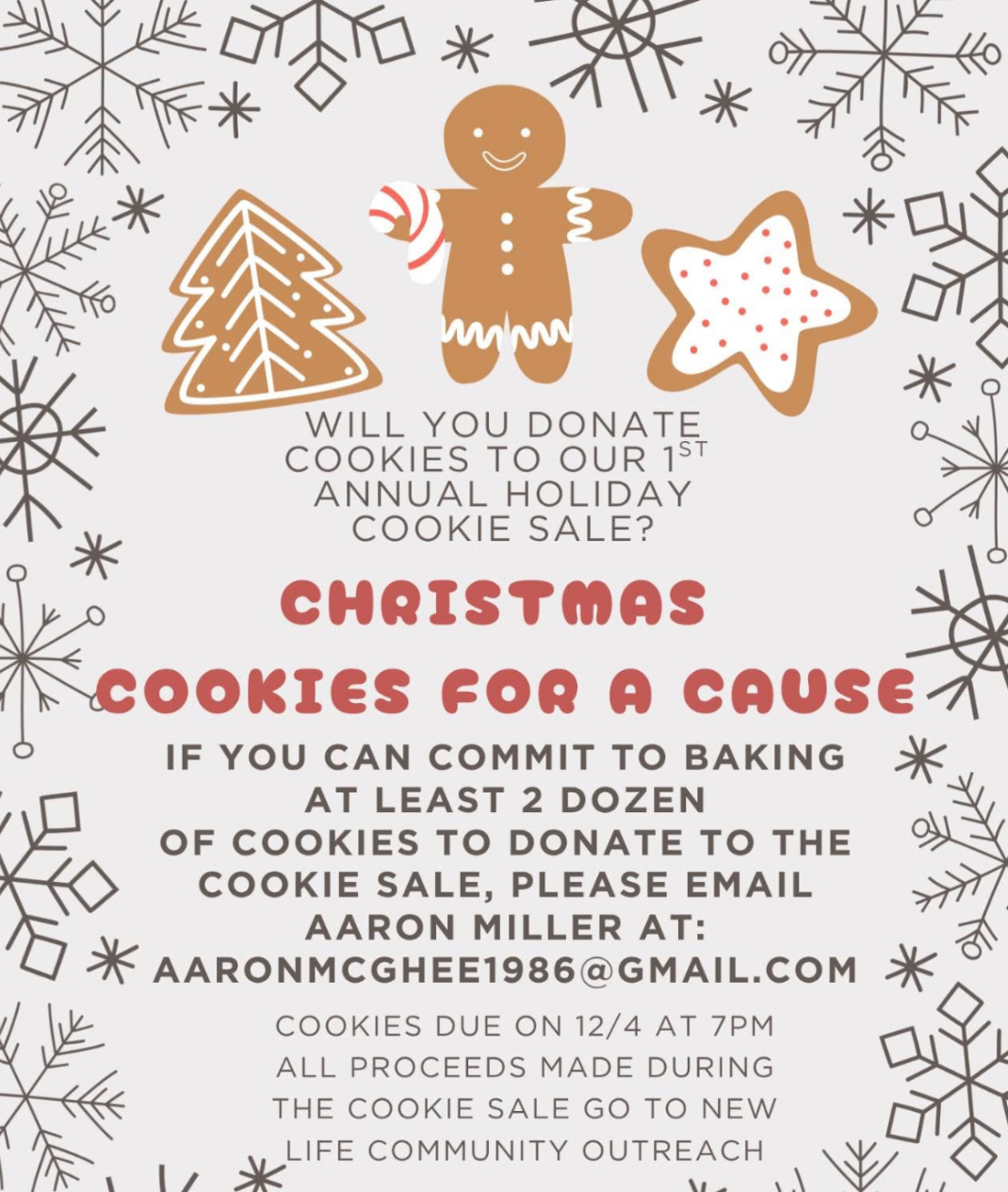 | And if you love to bake, we’re also gathering cookie donations for our first annual Holiday Cookie Sale — all proceeds benefit NLCO. If you can donate at least two dozen cookies, please email Aaron Miller, aaronmcghee1986@gmail.com. Cookies are due 12/4 at 7pm. |