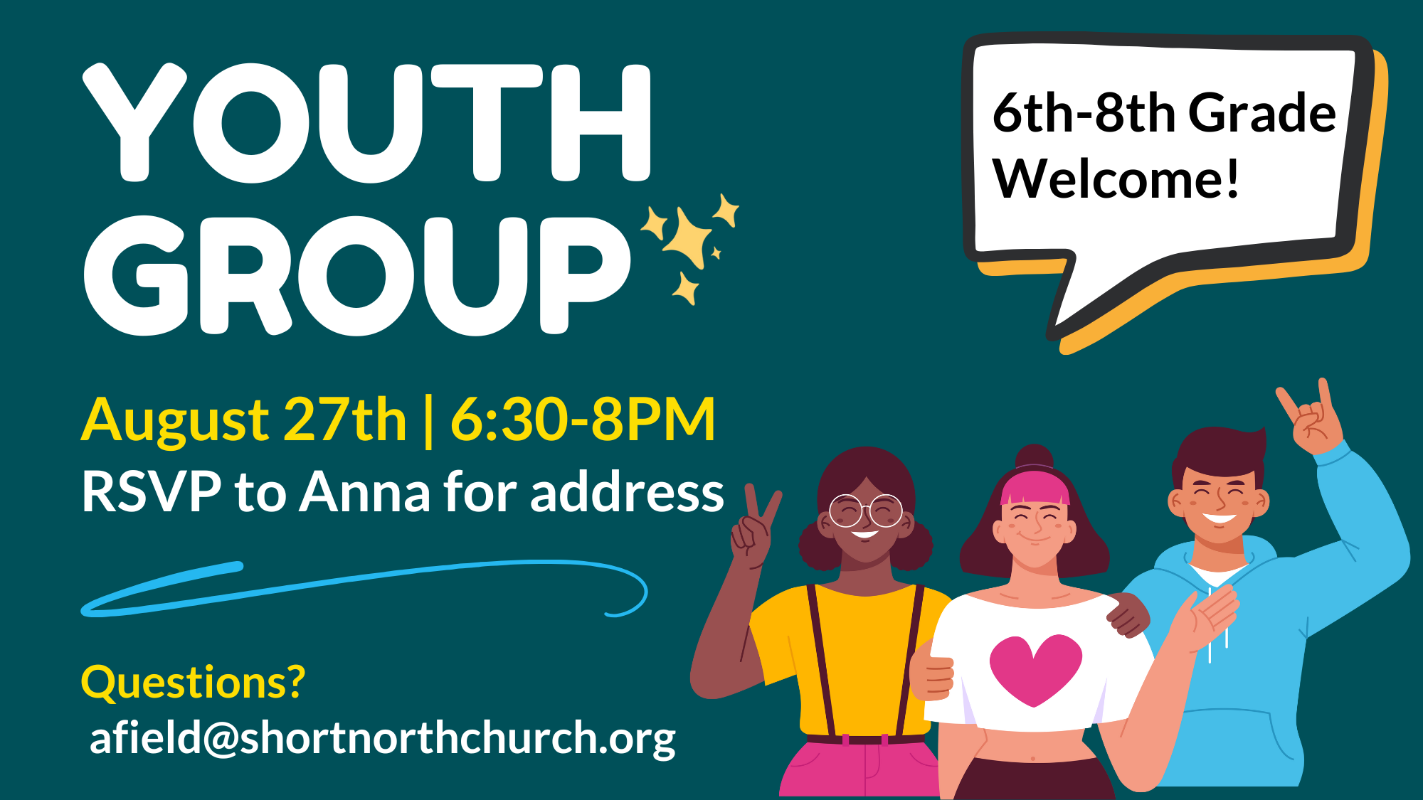 Students 6th-8th grade are invited to mingle and meet up. RSVP for address, afield@shortnorthchurch.org