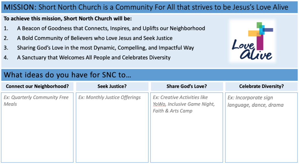 SNC VISION Click here to view the entire presentation We invite you to be a part of SNC’s Vision and to share your feedback with us on any of the four categories. SNC Vision Name First Last Email What ideas do you have for SNC to...Share your ideas or gifts you would like to offer to go with each of the 4 bucketsConnect our Neighborhood?Seek Justice?Share God's Love?Celebrate Diversity?Would you like to volunteer to lead any of the activities you shared in the buckets above?Please select the bucket(s) that have an activity you would like to lead at SNC Connect our Neighborhood Seek Justice Share God's Love Celebrate Diversity