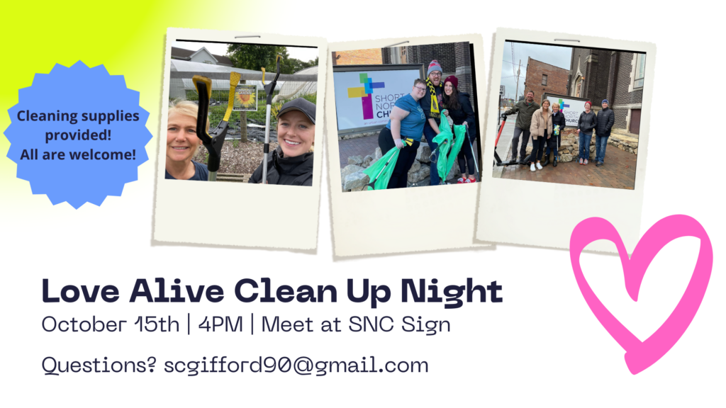Love Alive Clean Up Date October 15, 2023 Time 4:00 pm Category Community, Fellowship, Small Group Love Alive Clean Up Night Sunday, October 15th | 4PM | Meet at SNC Sign No RSVP Required. Questions? scgifford90@gmail.com