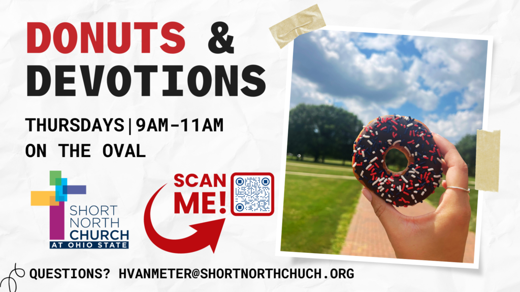 Looking for a midweek boost? Join us on The Oval for free donuts, good vibes and a quick devotion to start your day. No RSVP Required. Questions? hvanmeter@shortnorthchurch.org