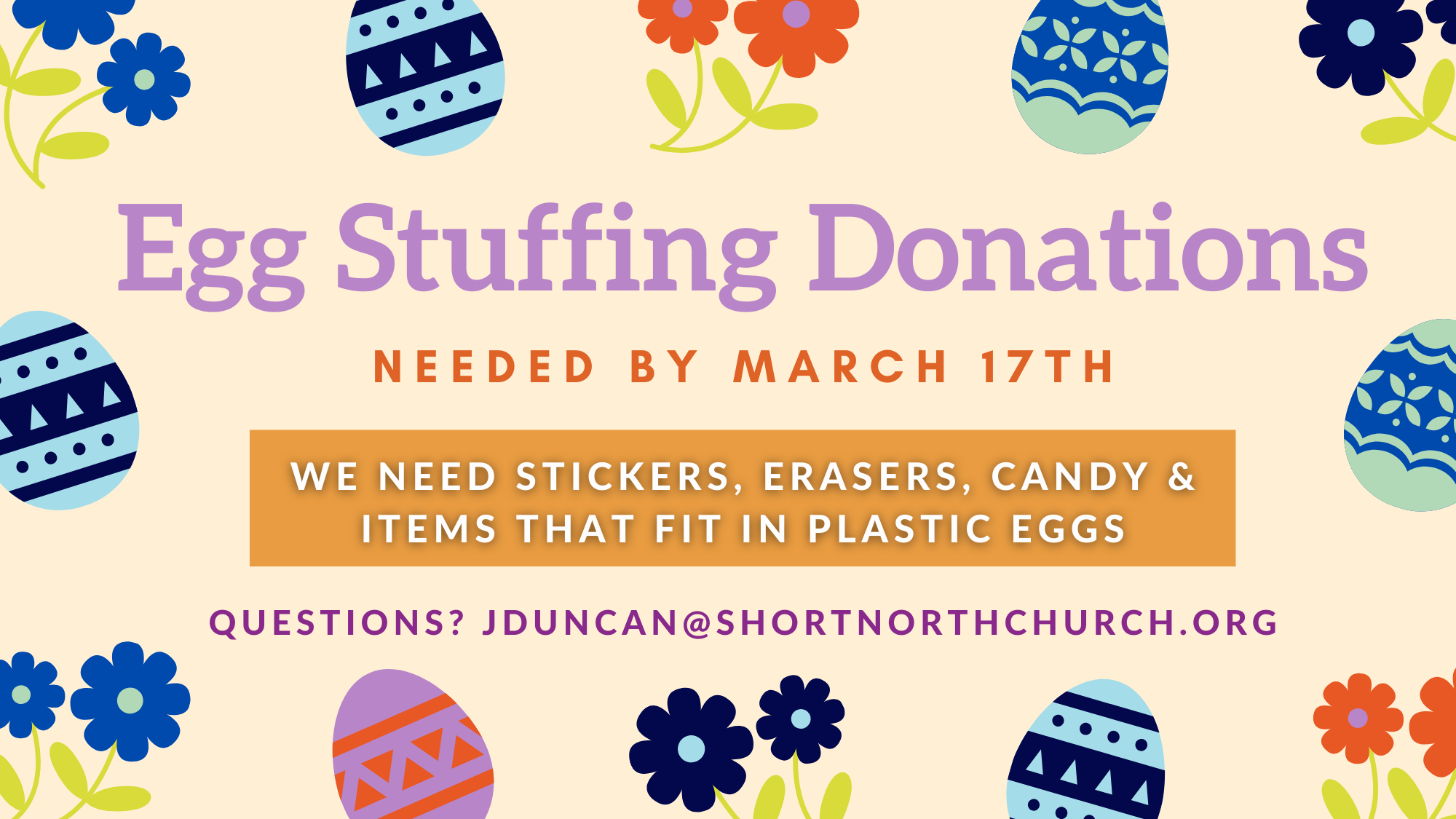 If you have candy, stickers, erasers and other items that will fit inside of plastic eggs, please bring them with you to SNC by March 17th. Questions?jduncan@shortnorthchurch.org