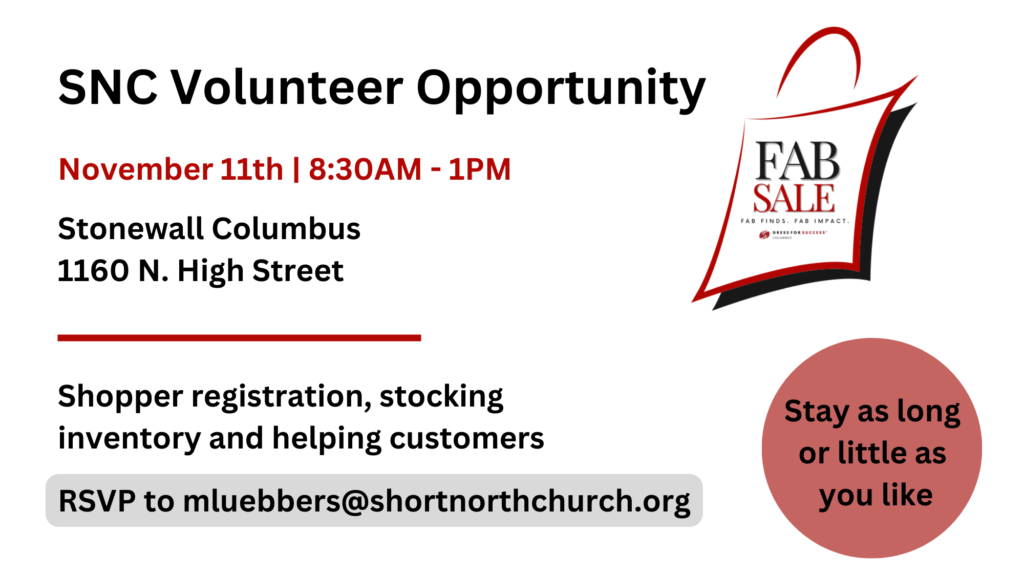 Volunteer any amount of time to help with shopper registration, stocking inventory, and customer interactions. This event will be held at 1160 N. High Street. RSVP to mluebbers@shortnorthchurch.org