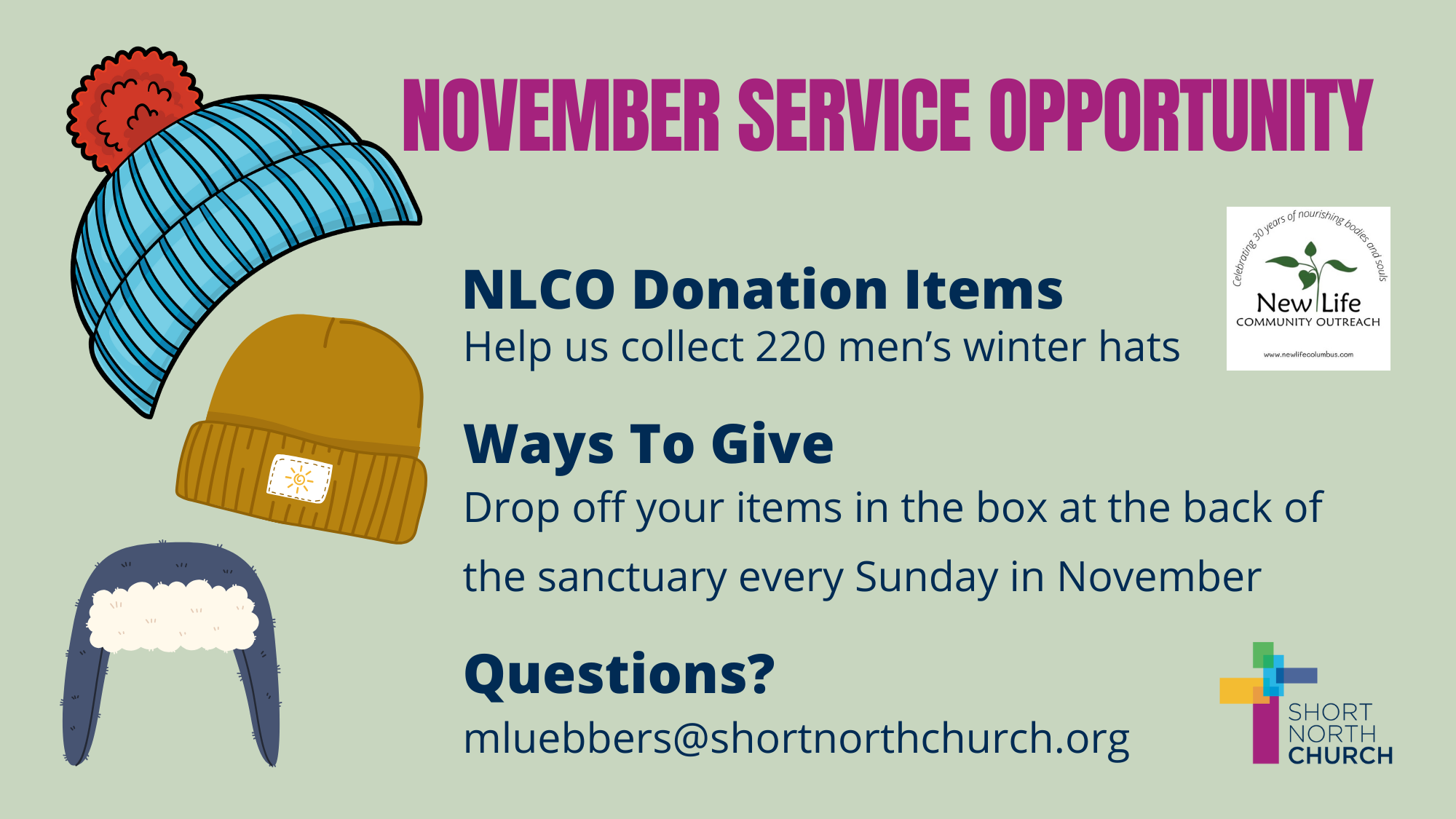 Winter Hat Collection: November Mission Date November 24, 2024 Category Community, Missions November Serving Opportunity: NLCO | COLLECTING DONATIONS ALL MONTH | newlifecolumbus.com This month, help us collect 220 men’s winter hats for New Life Community Outreach (NLCO).
