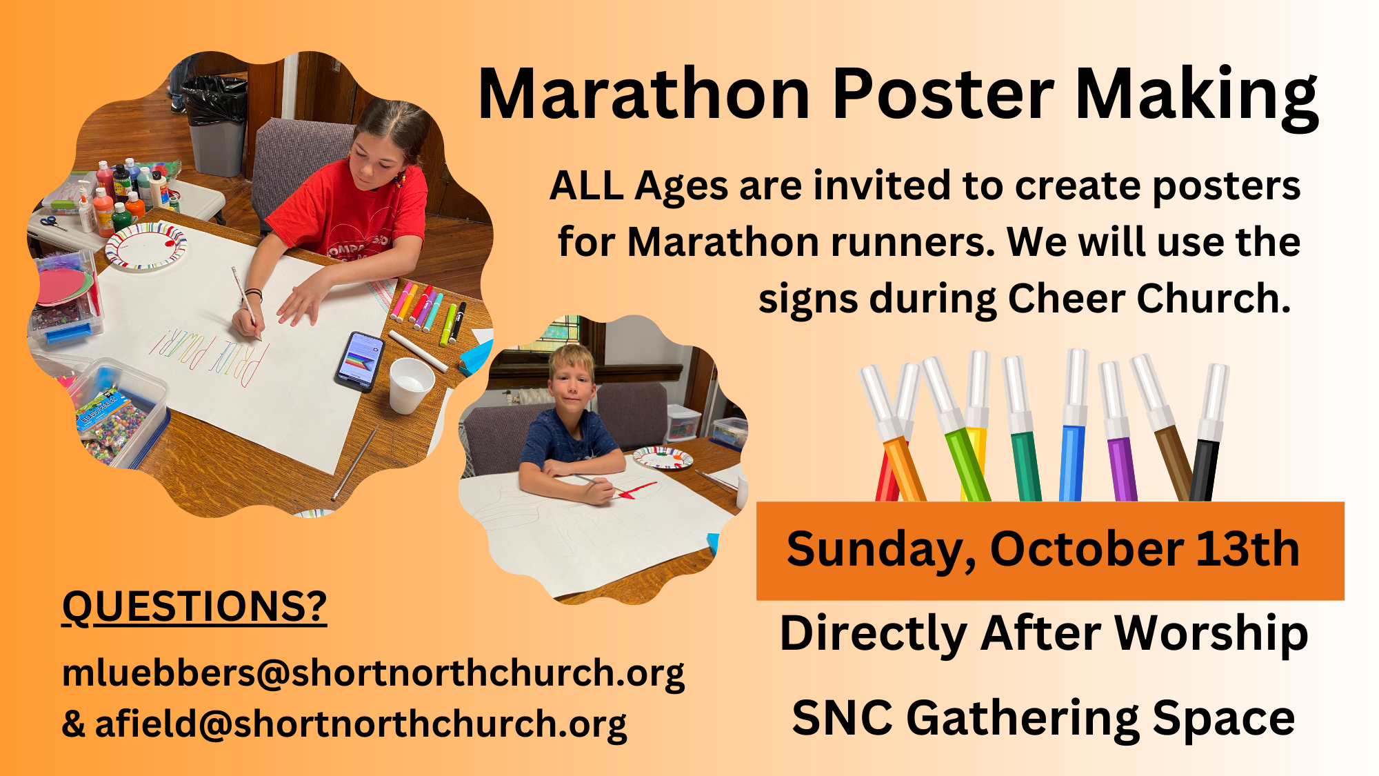 Create posters for cheer church and marathon runners. All ages are welcome, supplies provided, activity will be led by the SNC kids. Questions? mluebbers@shortnorthchurch.org & afield@shortnorthchurch.org