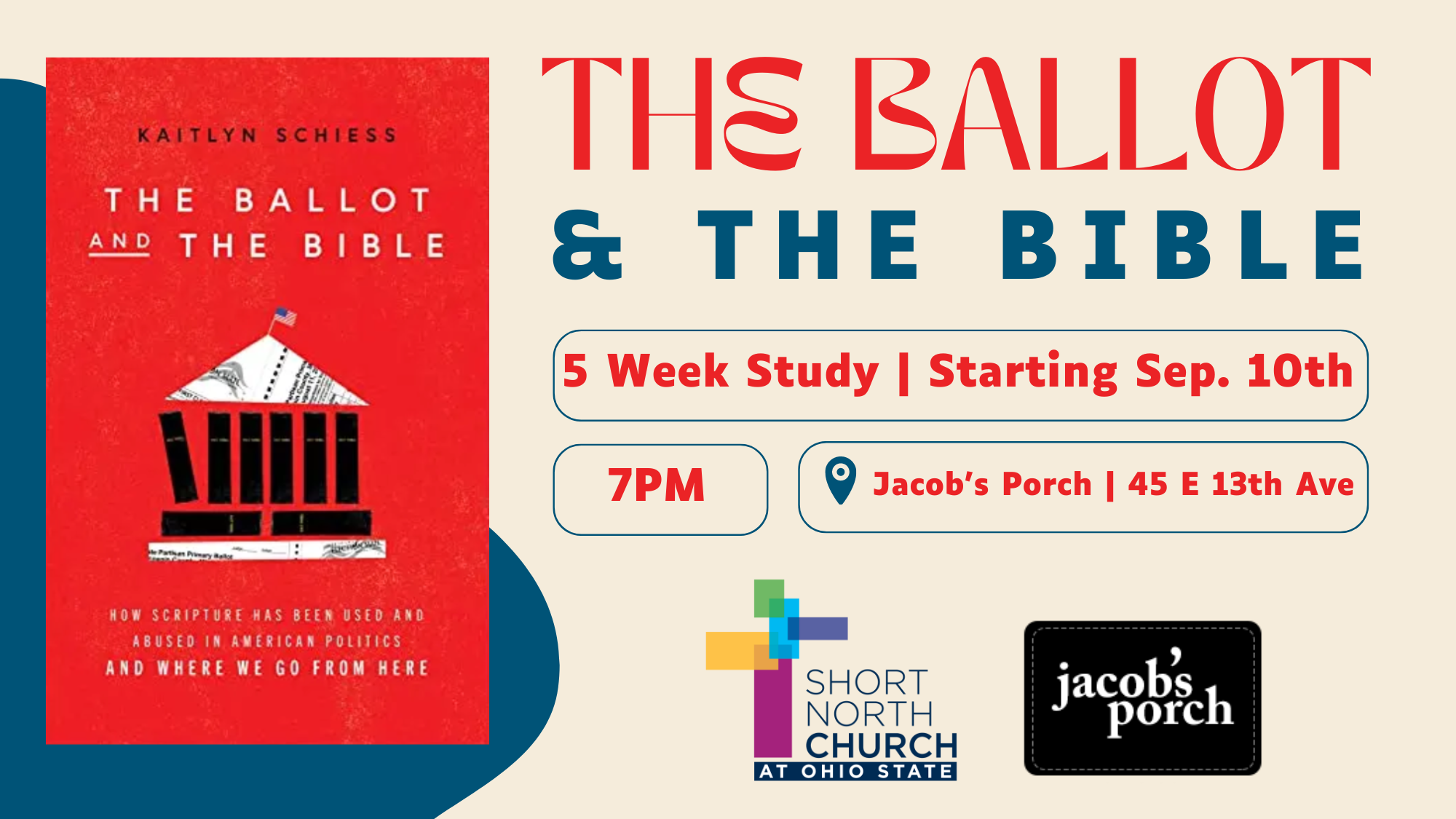 A 5-week study for college students on the book The Ballot & The Bible in partnership with Jacob’s Porch. Questions? hvanmeter@shortnorthchurch.org