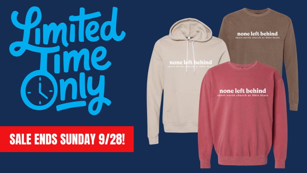 THIS WEEK ONLY! Shop limited-time SNC at OSU swag. We just added cozy long sleeves, perfect for fall. Swag is inspired by the parable of the lost sheep, Luke 15: 1-7. Click the link to shop our full selection of merch and support our ministry while you grab your favorites. The store closes Sunday, September 28th at 11:59PM. All items will be shipped directly to you.